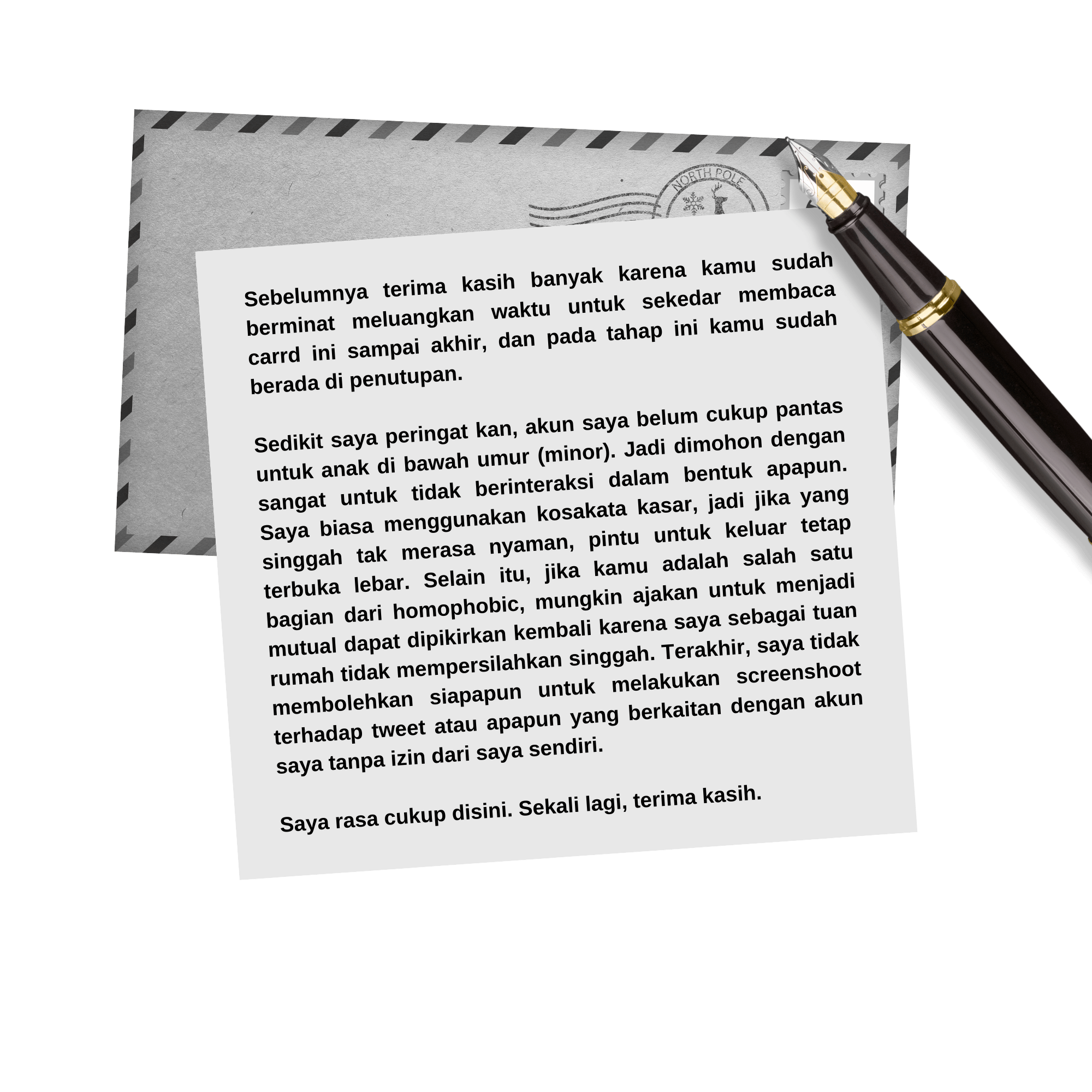 Saya menggunakan Taehyung Kim sebagai profil pengguna dan masculline sebagai frasa ganti. Umur saya sudah menginjak kepala dua, penat dan dahaganya hidup sudah saya cerna satu demi satu. Saya biasa menggunakan bahasa sehari-hari untuk bertukar pesan. Jika ingin menahu pasal MBTI saya, maka jawaban yang paling tepat ialah seorang ENTP yang kebetulan berzodiak Gemini.Atau lebih tepatnya bukan kebetulan, takdir. Saya termasuk penyuka kucing dan laut, bak mahakarya Tuhan paling elok yang dihantarkan ke bumi. Jadi, membalas atau sekedar retweet segala sesuatu mengenai kucing dan laut adalah kesenangan saya. Mungkin saya akan terlihat jarang menyapa di timeline, maka singgah lah sebentar ke bilik pesan. Karena saya akan lebih leluasa untuk berekspresi atau bertukar pikiran disana.Saya juga menyuka lantunan, tak jarang saya mengajak beberapa mutual untuk sekedar mendengar bersama, melalui Spotify. Biasanya lagu yang saya dengar dinyanyikan dengan elok oleh Anson Seabra, Adele, Keenan Te, The Neighbourhood, Colde, Frank Ocean, Kodaline, dan masih banyak lainnya yang tak bisa saya sebutkan satu demi satu karena tak akan pernah ada habisnya.Mengenai film, kalau boleh jujur, saya kurang tertarik menonton. Tapi jika diharuskan untuk memilih, saya akan memilih film dengan genre horror, gore, comedy atau action. Saya juga kurang menyukai film ber-episodes, rasanya seperti membuang-buang waktu tanpa ada titik penyelesaian karena berujung suntuk.Terakhir, saya juga gemar bermain game jika ada waktu senggang. Biasanya bermain Sudoku, tetapi belakangan ini saya lebih sering bermain Genshin Impact dan berencana mencoba Wuthering Waves.